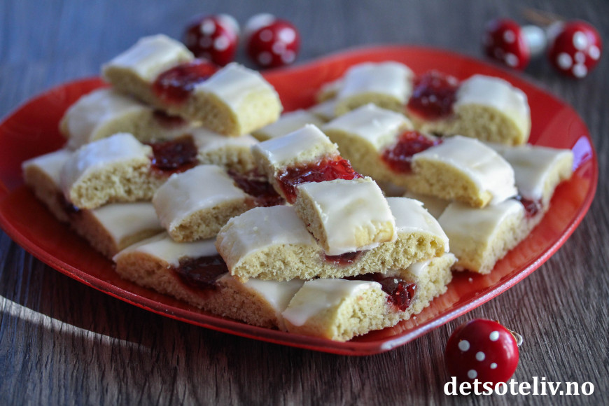 Stek kakene midt i ovnen ved 175 °C i 12-15 minutter. Rør imens sammen melis og vann til en passe tykk melisglasur. Smør melisglasuren over de ferdigstekte kakene mens de er varme. La kakene avkjøles en stund og skjær dem deretter opp i stenger.