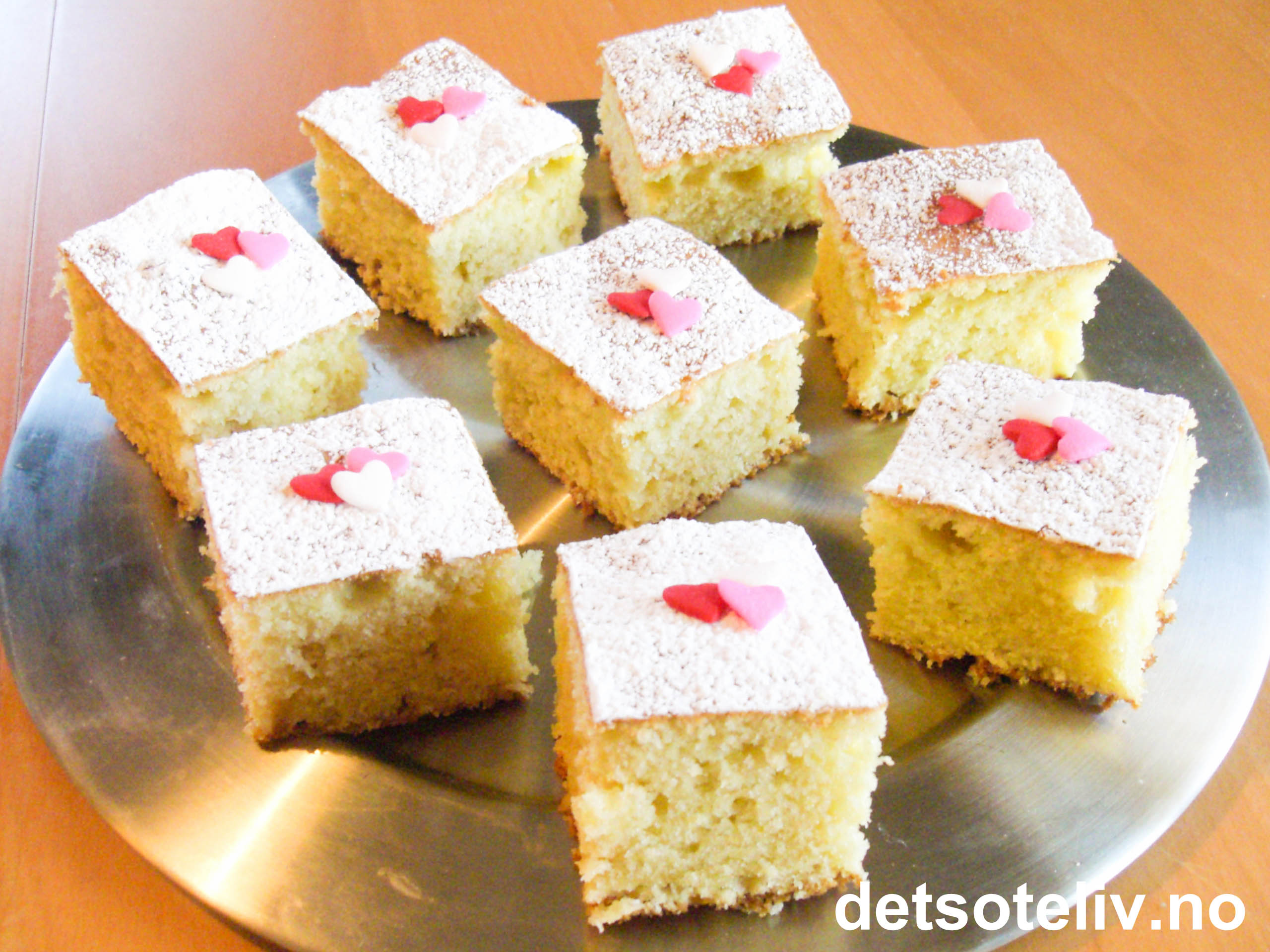 Kaken er fin å fryse. Sikt over litt mer melis før servering, da ser de tinte kakene ut som ferske. Kakene på bildet er i tillegg pyntet med kakepynt i form av hvite, rosa og røde hjerter (fås kjøpt blant annet hos Tilbords).