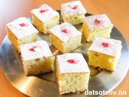 Del kaken opp i passe store firkanter. Sikt over melis før servering og pynt kakestykkene eventuelt med litt kakepynt.