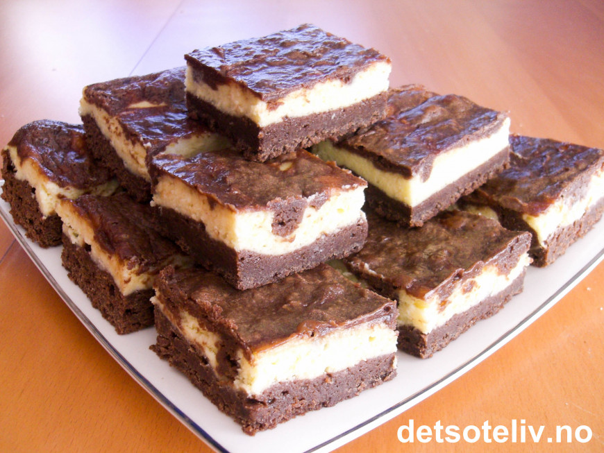 Ha 2/3 av browniesdeigen utover i en bakepapirkledd, liten langpanne (ca 20x30 cm). Fordel ostekakedeigen over browniesdeigen. Ha så resten av browniesdeigen over ostekakemassen i et tynt lag. Dette gjøres lettest ved å ringle over deigen med en skje og så stryke deigen forsiktig utover med en smørekniv.