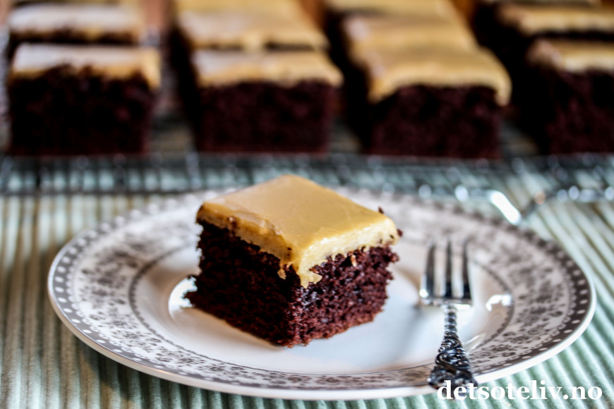 "Maddes sjokoladekake" er en spesiell og utrolig god langpannekake. Deigen inneholder faktisk 10 store egg i tillegg til mye smør, sukker og kakao, noe som gir en ekstraordinær konsistens og vidunderlig smak på kaken! På toppen er kaken glasert med et tynt lag kaffeglasur.