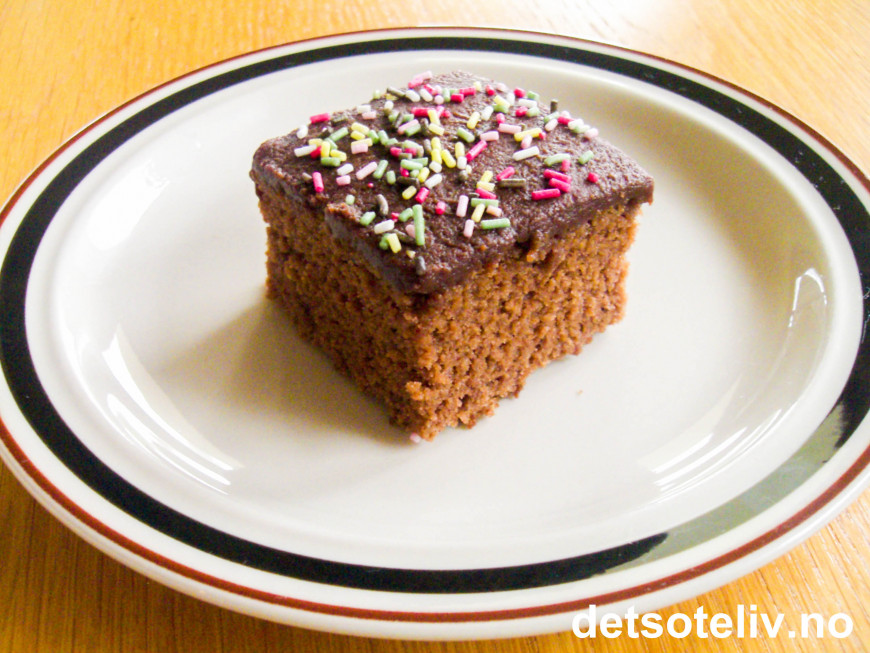 Dette er en saftig, mørk sjokoladekake som dekkes med en nydelig glasur laget med hvit sjokolade. Glasuren kan eventuelt farges med konditorfarge, men det er ikke gjort med kaken på bildet. Kakestykkene pyntes med raspet sjokolade og blir superdelikate!